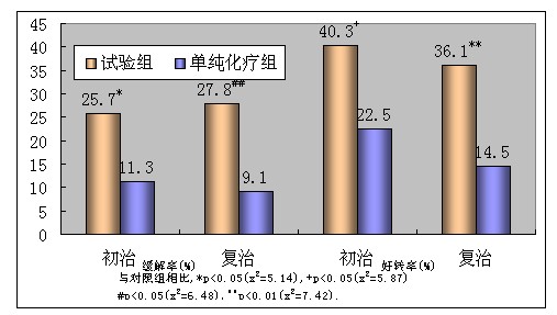 尿多酸肽聯合化療試驗組病人301例,可評價療效252例,總緩解率(CR+PR%)為26.6%(ITT:22.3%)。總好轉率為(CR+PR+MR%)38.5%(ITT:32.2%);單純化療對照組病人153例。可評價療效126例,總緩解率10.3%(ITT:8.5%),總好轉率19.0%(ITT:15.7%)。試驗組療效顯著高于單純化療組(見表1)。其中尿多酸肽聯合化療試驗組非小細胞肺癌、原發性肝癌、乳腺癌患者的緩解率分別為41.6%、8.9%、38.5%,也明顯高于對照組(18.8%、3.8%、8.0%),而且提高到2倍以上。試驗組初治療病倒、復治病例的緩解率25.7%、27.8%,均明顯高于對照組(11.3%、9.1%),而且對復治的病人顯示出更為突出的治療效果(見圖一)
