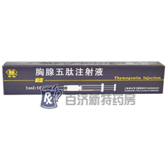 【藥理毒理】本品為免疫雙向調節藥。具有誘導和促進T淋巴細胞及其亞群分化、成熟和活化的功能,調節T淋巴細胞的比例,使CD4+/CD8+趨于正常;調節和增強人體細胞免疫功能的作用,能促進有絲分裂原激活后的外周血中的T淋巴細胞成熟,增加T細胞在各種抗原或致有絲分裂原激活后各種淋巴因子(如:α、γ干擾素、白介素2和白介素3)的分泌,增加T細胞上淋巴因子受體的水平。它同時通過對T輔助細胞的激活作用來增強淋巴細胞反應。此外,本品可能影響NK前體細胞的趨化,該前體細胞在暴露于干擾素后變得更有細胞毒性。因此具有調節和增強人體細胞免疫功能的作用。本品可增強巨噬細胞吞噬功能及增強紅細胞免疫功能,提高自然殺傷細胞活性和白介素-2的產生水平與受體表達水平,增強外周血單核細胞γ-干擾素的產生,增強血清中超氧化物歧化酶活性。急性毒性試驗:大鼠肌肉注射劑量達44.4mg/kg,小鼠腹腔及靜脈給藥劑量達300mg/kg;分別為成人用量的2664倍和18000倍,未見動物死亡和毒性反應。長期毒性試驗:在為期12個月的長毒試驗中,分別對大鼠、狗給予胸腺五肽,最高劑量達80mg/kg/天、未發現有意義的癥狀體征變化。無論是動物的行為、生長發育、血液學、血液生化學及組織學方面,均未見明顯變化。