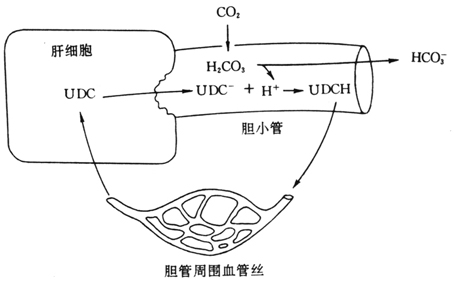 此外, UDCA尚有下列作用:(1)“替代”作用:膽汁淤積時(shí),膽汁酸的穩(wěn)定狀態(tài)發(fā)生改變,膽汁酸池減少,疏水性毒性膽汁酸產(chǎn)生。應(yīng)用UDCA后,體內(nèi)膽汁酸池?cái)U(kuò)充,毒性膽汁酸由UDCA替代。UDCA可能具有直接的肝細(xì)胞保護(hù)作用;(2)UDCA能抑制腸內(nèi)其他膽汁酸吸收,其作用類似于消膽胺;(3)利膽作用:內(nèi)源性膽汁酸僅在與甘氨酸或牛磺酸結(jié)合后才能分泌入膽汁,而UDCA可以以非結(jié)合性陰離子形式分泌。非結(jié)合性UDCA離子在膽管內(nèi)很易質(zhì)子化。來自膽管上皮/血漿的H 2 0和CO 2 在膽管內(nèi)起反應(yīng),釋出H + ,與UDCA結(jié)合生成UDCAH,后者具有嗜脂性,迅速從膽管吸收,進(jìn)入膽管周圍血管叢內(nèi),然后回入肝內(nèi),再分泌入膽汁,從而促發(fā)膽汁流,是為“膽肝短路機(jī)制”(cholehepatic shunt mechanism) (圖-2)。 增加的膽汁流可從膽管內(nèi)移除膽栓,有助于消除膽汁淤積。