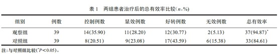 經治療,觀察組患者的總有效率明顯高于對照組(P<0.05)。兩組患者治療后的總有效率,見表1。