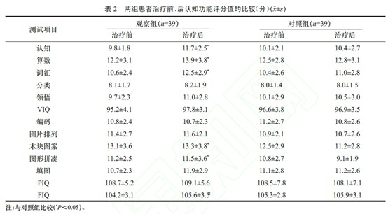 兩組患者治療前、后FIQ、VIQ、PIQ 各指標值經比較其差異無統計學意義(P>0.05);觀察組患者治療后的認知、算數、詞匯、圖形拼湊分值明顯高于治療前(P<0.05)。其治療前、后認知功能情況,見表2。