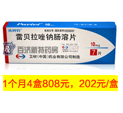 雷貝拉唑鈉為白色-微黃白色的粉末,無氣味,分子量為381.43。本品極易溶于水或甲醇,也易溶于無水乙醇或乙酸乙酯,幾乎不溶于乙醚或乙烷。本品不顯示旋光性,具有吸濕性,其熔點為225℃,在pH值為7.0 的水/辛烷系中的分配系數約為214。本品為淡黃色薄膜衣片劑(腸溶片)。